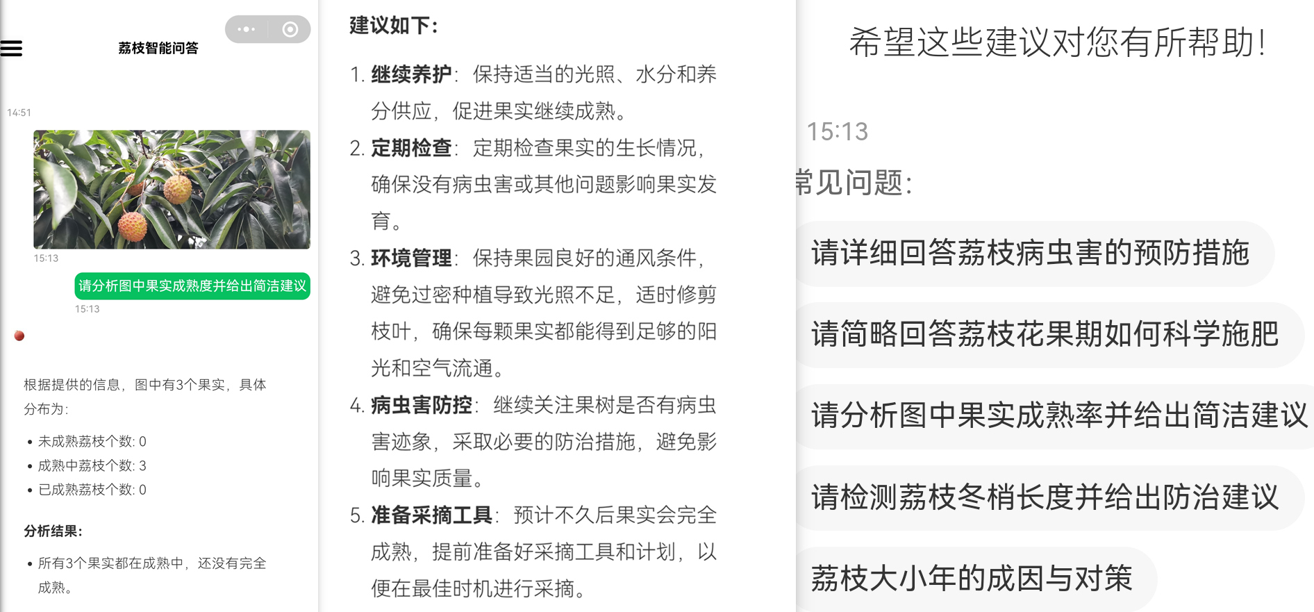 “荔知君”是团队专为荔枝产业打造的垂直领域大语言模型,基于多模态数据训练,融合了荔枝栽培、病虫害防治、全物候期管理等专业知识,为果农提供精准、高效的农事支持。其中,权威知识库,能够基于本地化种植数据库精细化调整模型参数,为不同品种、物候期定制方案;智能交互系统,支持文字、图片双模态输入,能精准识别荔枝状况(如叶褪色、果成熟等),并推荐防治方案对症下药;动态决策系统,结合无人机遥感数据实时优化建议,越用越懂果园需求,提供差异化农事指导。