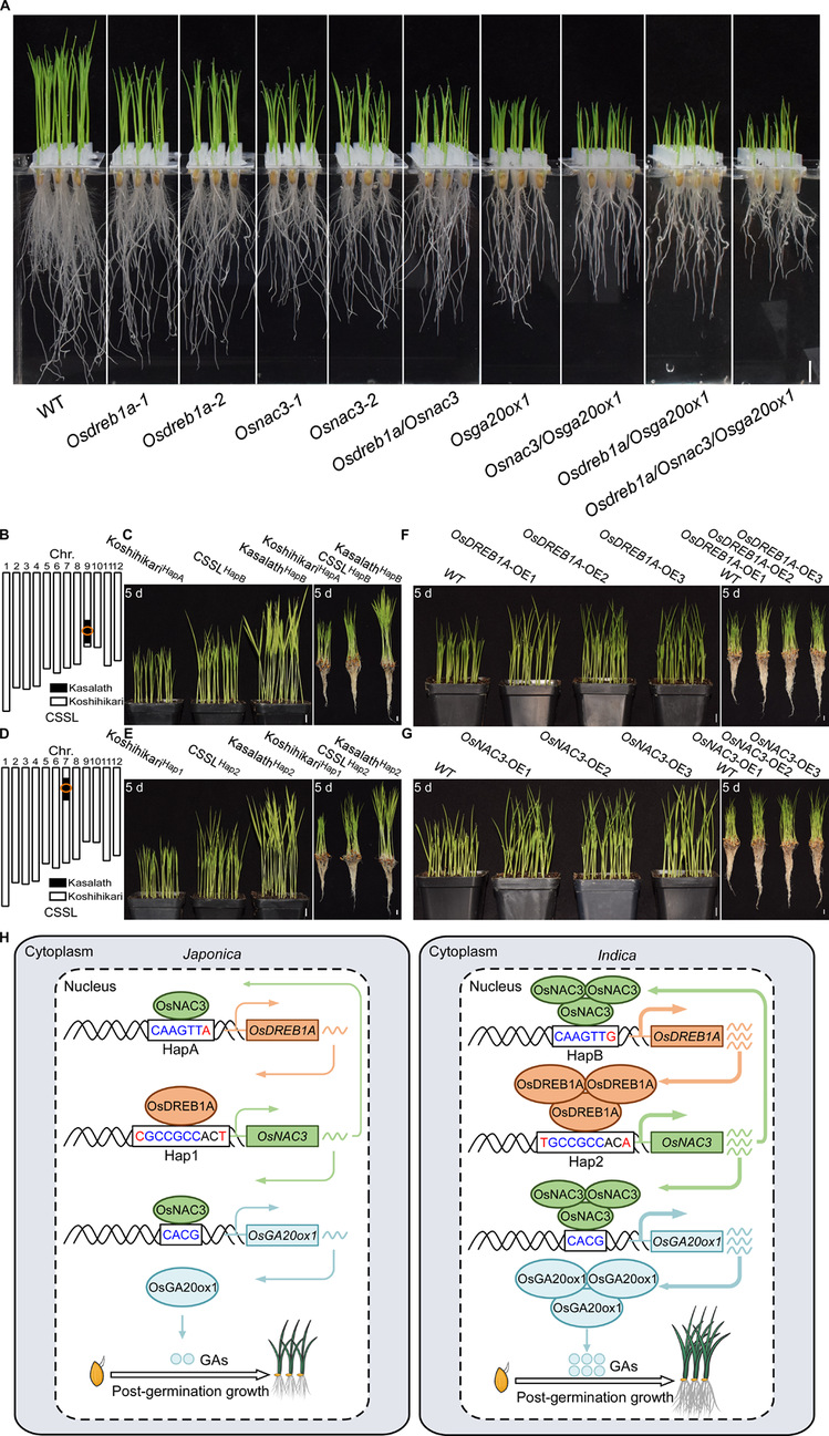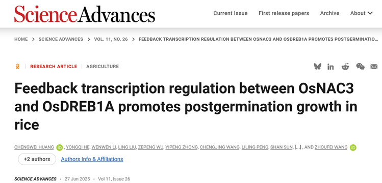 近日,农学院、广东省高等学校未来作物精准育种基础研究卓越中心王州飞教授团队在Science子刊Science Advances在线发表了题为“Feedback transcription regulation between OsNAC3 and OsDREB1A promotes post-germination growth in rice”的研究论文。该研究揭示了OsDREB1A-OsNAC3-OsGA20ox1转录模块通过赤霉素途径调控水稻芽期生长的分子机制,并明确了其在育种中的利用价值。