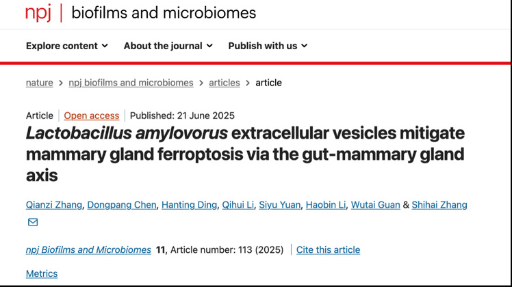 近日,《自然》(Nature)旗下期刊npj Biofilms and Microbiomes(影响因子9.2,中科院一区,Top期刊)在线发表了乐竞在线注册动物科学学院管武太/张世海团队的研究论文Lactobacillus amylovorus Extracellular Vesicles Mitigate Mammary Gland Ferroptosis via the Gut-Mammary Gland Axis。该研究阐明了肠源嗜淀粉乳杆菌通过细胞外囊泡的介导作用,向乳腺上皮细胞膜上富集单不饱和脂肪酸,从而增强乳腺上皮细胞的铁死亡抵抗能力,减轻氧化应激对母畜泌乳性能造成的不利影响,为微生物调控泌乳障碍提供了新的研究思路。