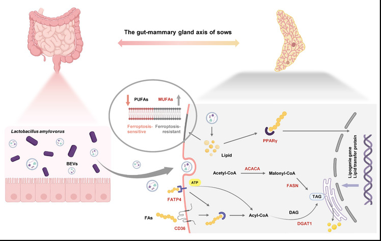 研究结果表明,氧化应激可激活铁死亡通路,削弱乳腺脂质合成与转运效率。值得关注的是,嗜淀粉乳杆菌在肠道中释放的细胞外囊泡通过“肠道-乳腺轴”运输至乳腺,随后释放囊泡中的脂肪酸进入乳腺上皮细胞,提高细胞膜中单不饱和脂肪酸与多不饱和脂肪酸的比值,从而增强细胞对铁死亡的抵御能力。该机制通过提升乳腺的脂质合成与转运效率,有效缓解了氧化应激诱导的母畜泌乳性能下降。