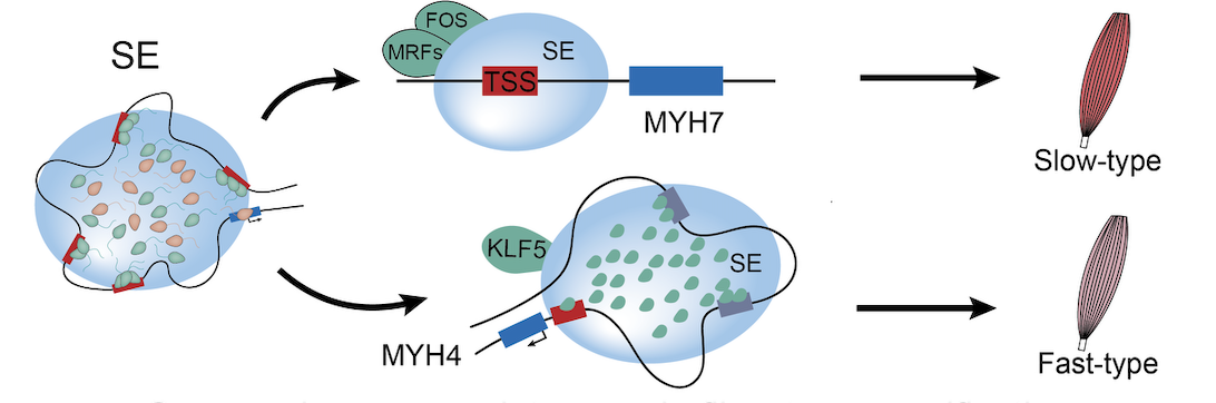 表观遗传调控机制研究为肌肉品质改良提供了新视角。增强子等顺式调控元件的组蛋白修饰状态及其介导的染色质三维构象动态变化,是肌纤维分化与类型转化的潜在分子开关。本研究利用瘦肉型杜洛克猪的氧化型比目鱼肌(SOL)和酵解型趾长伸肌(EDL)为研究对象,通过联合染色质免疫共沉淀(ChIP-seq)及高通量染色质构象捕获测序(Hi-C)等多组学测序技术,系统解析了超级增强子(SE)介导染色质三维互作调控肌纤维类型定向分化及转化的功能及机制。