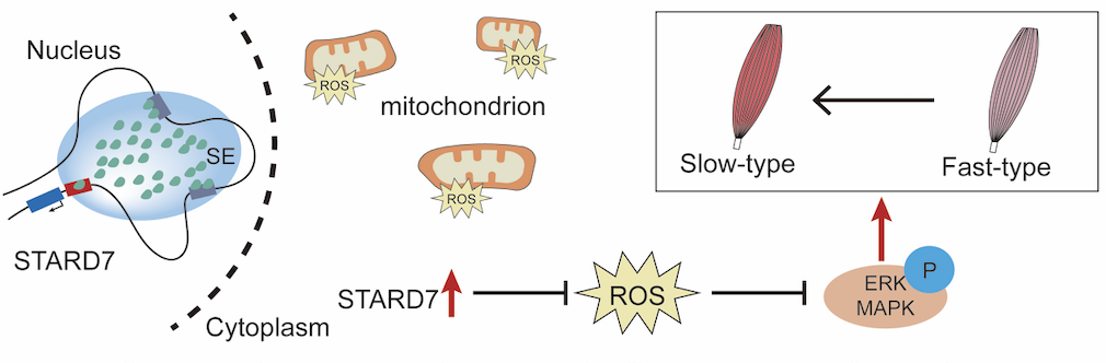 研究通过整合多组学分析,首次系统揭示了不同代谢类型骨骼肌的增强子-启动子三维互作差异,重点揭示了超级增强子通过协同转录因子,介导染色质环或近端互作激活MYH4等肌纤维类型决定基因的表达,进而调控肌纤维类型的定向分化方向;同时揭示STARD7通过降低活性氧水平和抑制ERK信号通路促进肌纤维向氧化型转化,其本身基因表达受超级增强子介导的染色质环调控。研究结果不仅有助于建立畜禽肉质改良新技术,也为人类肌肉代谢疾病治疗提供了借鉴。