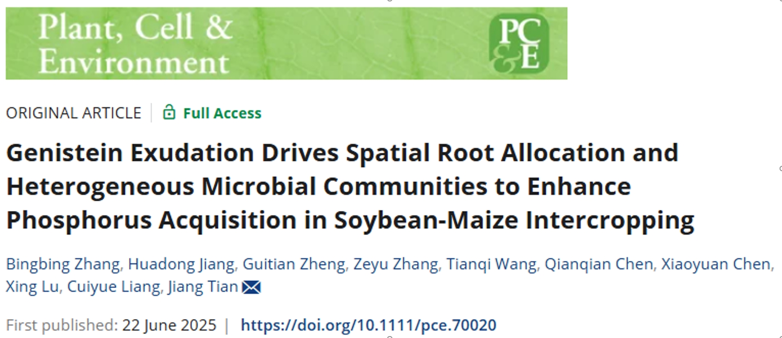 近日,资源环境学院根系生物学研究中心田江研究员课题组在《Plant, Cell & Environment》(中科院一区Top期刊)发表题为“Genistein exudation drives spatial root allocation and heterogeneous microbial communities to enhance phosphorus acquisition in soybean-maize intercropping”的研究论文。