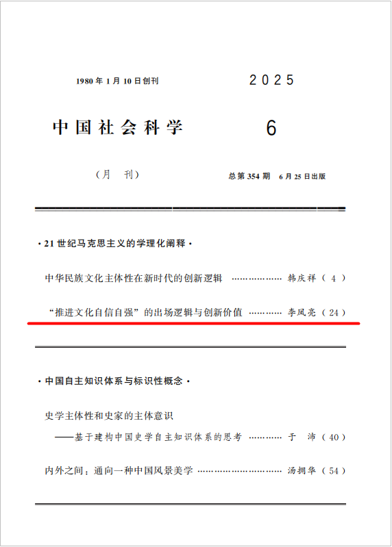 《中国社会科学》2025年第6期目录,李凤亮教授发表重要学术文章《“推进文化自信自强”的出场逻辑与创新价值》
