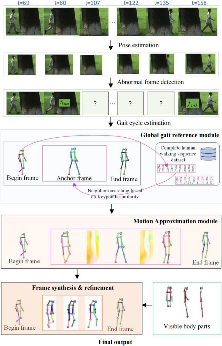 论文旨在恢复长距离严重遮挡的步态样本。步态识别能够在远距离通过行走方式识别目标对象,且无需对象的主动配合。步态容易受到不同干扰因素(如物体遮挡、行人遮挡等)的影响,从而产生异常步态样本。现有的步态识别方法主要侧重于设计更精细的深度步态识别网络,而针对异常步态样本恢复的研究仍极为有限。由于现有步态遮挡恢复方法在恢复过程中未充分考虑步态周期特征,难以从语义层面提供长期预测。本文提出了一种基于帧生成的长期异常步态恢复框架,该框架包含三个模块:用于发现锚定帧以提供生成指导的全局步态参考模块、用于预测运动信息的运动近似模块,以及用于增强步态规律性的帧优化模块。实验结果表明,所提出的三个模块均能显著提升帧生成性能。整体异常步态恢复框架显著优于现有的最先进视频帧插值方法,并使现有深度步态识别模型在各类具有挑战性的步态数据集上实现了更高的识别准确率。