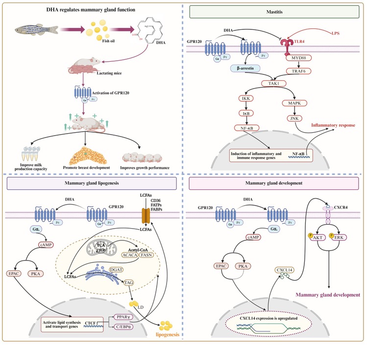 传统观点认为,n-3多不饱和脂肪酸(如DHA)主要通过抗炎作用间接改善乳腺功能。然而,本研究发现,即使在非炎症状态下,补充n-3脂肪酸仍能显著提升泌乳性能,提示存在未被阐明的直接调控机制。研究团队发现,GPR120在哺乳期乳腺组织中特异性高表达,且其表达水平随泌乳进程逐步上升。进一步机制研究表明,n-3脂肪酸通过激活乳腺上皮细胞膜上的GPR120受体,触发Gαs介导的cAMP信号级联反应,该过程完全独立于经典的炎症调控通路。