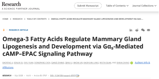 近日,乐竞在线注册动物科学学院管武太教授与张世海副教授团队在国际权威期刊《Research》(影响因子10.7,中科院一区Top,《Science》自1880年创建以来第一本合作期刊)在线发表题为《Omega-3脂肪酸通过Gαs介导的cAMP-EPAC信号通路调控乳脂合成和乳腺发育》的研究论文。该研究突破传统认知,首次揭示G蛋白偶联受体GPR120通过全新的“GPR120-cAMP”非炎症信号通路直接调控乳腺功能,为泌乳障碍的靶向干预提供了重要理论依据。