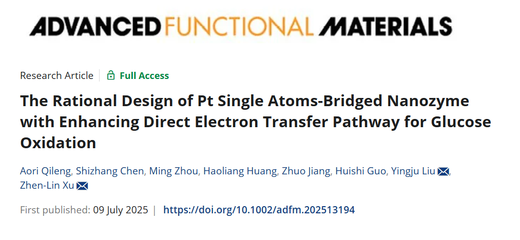 近日,食品学院徐振林教授与材料与能源学院刘英菊教授团队合作在Advanced Functional Materials上发表了题为“The Rational Design of Pt Single Atoms-Bridged Nanozyme with Enhancing Direct Electron Transfer Pathway for Glucose Oxidation”的研究论文。该研究揭示了类葡萄糖氧化酶活性的纳米酶在催化葡萄糖时的直接电子转移机制,并实现了在生物基质样品中葡萄糖的高灵敏实时监测。