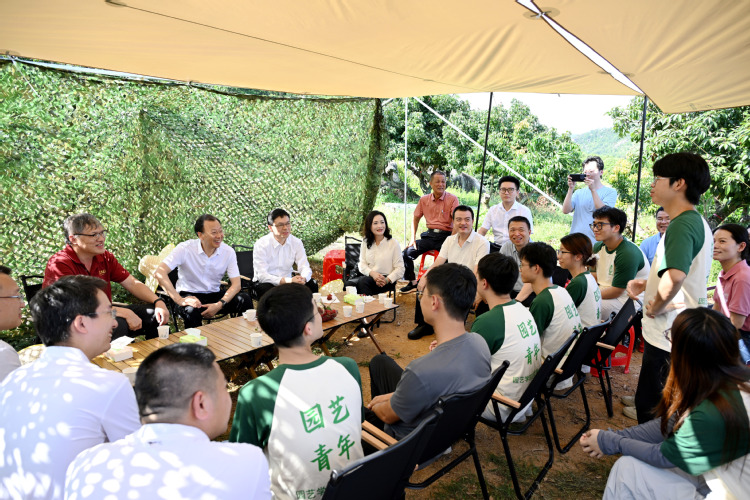 调研期间,李凤亮专程前往汕头市潮南区雷岭镇荔枝种植示范基地、汕尾市建茶园农业科技有限公司,看望了正在开展暑期“万名学子乡村大调研行动”的园艺学院和植物保护学院师生团队,听取华农学子发挥专业特长,助力雷岭荔枝、汕尾油柑等地方“土特产”发展的情况汇报。“希望大家从果园里把课题带回去,跟着老师刻苦学习,努力成长成才。”李凤亮肯定了同学们的实践成果,勉励大家再接再厉,为乡村全面振兴贡献青春力量,并叮嘱大家做好个人防护,确保调研安全。