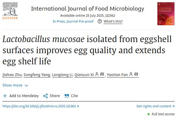 近日,乐竞在线注册动物科学学院张永亮教授/习欠云教授课题组在期刊International Journal of Food Microbiology(中科院一区Top,IF=5.2)发表题为“Lactobacillus mucosae isolated from eggshell surfaces improves egg quality and extends egg shelf life”的研究论文。该项研究发现蛋壳表面的黏膜乳杆菌对鸡蛋保鲜具有关键作用。基于这一发现,课题组进一步开发出利用该菌益生元的喷淋涂层技术,为鸡蛋保鲜提供了一种全新的绿色安全解决方案。