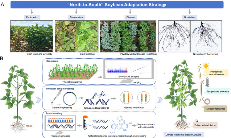 文中还提出实施方案:运用环境基因型分析,平衡短日照、极端温度等环境压力,识别影响大豆适应性的环境协变量,建立提升产量稳定性与适应性的预测育种框架。针对低纬度地区改良基因型,借助系统发育学法,结合大豆基因组重测序技术,收集适应性性状数据。利用基因组选择,实现抗逆性预测、等位基因剂量优化、适应性图谱绘制和气候智能型作物培育等关键技术突破。通过精准基因组学、合成生物学、转基因和基因编辑育种技术,培育适应低纬度环境的优良大豆品种。同时,将人工智能与组学工具相结合,加速基因鉴定,助力环境适应型智能大豆育种。此外,实施综合病害管理策略,开发高效养分利用的大豆品种,筛选适应当地的根瘤菌以及开发细菌肥料,促进生态平衡和可持续农业发展,最终培育出聚合光不敏感、耐温度胁迫、抗病且固氮效率高的优良性状大豆品种(图1)。