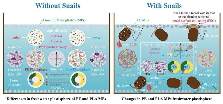 针对塑料制品进入土壤或者水体环境后形成大量塑料际(plastisphere)而产生新的生态风险问题,本团队通过微宇宙实验探析了外来入侵生物福寿螺通过反复摄食-排泄微塑料等过程对淡水塑料际细菌群落的影响及风险。研究结果发现,福寿螺会通过其腹足表面收集行为(Pedal Surface Collecting,PSC)捕获或摄取水体中的微塑料,并经过其肠道消化后排出部分微塑料,与无福寿螺存在的水体环境相比,这个过程显著改变水体中常规聚乙烯(PE)和生物可降解聚乳酸(PLA)两种塑料际的细菌群落组成、多样性及功能特征,并使这两种塑料际的细菌群落结构呈现一定的趋同性,且与福寿螺肠道细菌群落结构的相似性增加。同时,福寿螺的存在和转化作用降低了水体中两种塑料际上与生物膜形成、反硝化和塑料降解等作用相关的细菌丰度,增加了塑料际携带可移动基因元件(Mobile Genetic Elements,MGEs)的细菌丰度,进而可能加大塑料际给人类健康带来的风险。研究结果可为揭示塑料际作为人类病原体载体在动物肠道之间及动物肠道与生态环境之间的传播风险提供科学依据。相关论文发表在Journal of Hazardous Materials期刊。