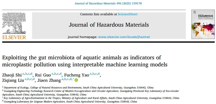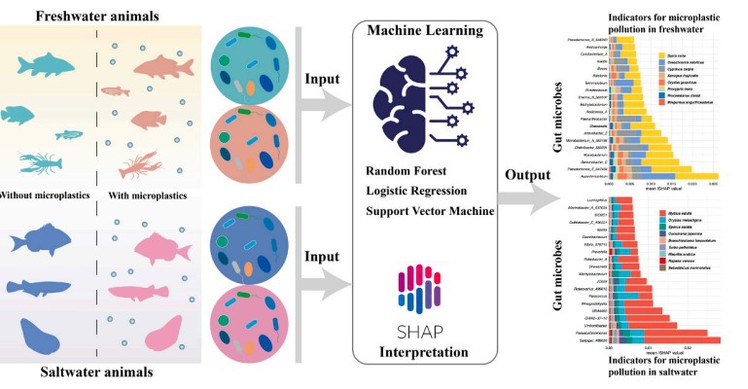 针对微塑料在水生生态系统中的广泛分布及其对水生生物的危害影响,团队通过整合无微塑料和有微塑料污染情境下的17种淡水生物和海水生物(共634个样本)的公开测序数据,以这些水生生物的肠道微生物类群作为研究对象和指示指标,采用可解释机器学习模型方法,研究发现微塑料显著改变淡水与海水动物肠道菌群的组成和功能,并降低其功能冗余性。基于属级分类的随机森林模型和SHAP值分析,筛选出与水体微塑料污染密切相关的20个淡水动物的微生物类群(如Aurantimicrobium)和25个海水动物的微生物类群(如Salipiger_489036)等关键指示菌群。进一步研究发现,这些指示微生物类群的重要性受宿主物种和微塑料污染特征(如微塑料浓度、暴露时间、颗粒大小等)的影响。本研究成果可为水环境中微塑料污染的指示生物—肠道微生物特征类群的筛查与诊断指标的确立及其风险评估提供科学参考。相关论文发表在Journal of Hazardous Materials期刊。