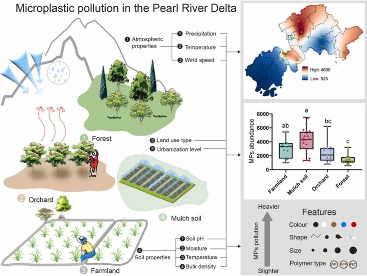 针对珠江三角洲地区城市化、工业化和集约化农业的高度发展以及城乡交错融合的分布格局,导致塑料制品应用场景多、使用量大,土壤环境中微塑料分布和成因复杂等系列问题,研究团队通过对珠三角地区23个采样地点、四种土地利用类型(覆膜地、农田、果园和森林)土壤的系统调查,探究了该区域不同地区、不同土地利用方式下土壤微塑料类型、丰度、颜色、粒径和形态等分布及变化特征。研究发现,覆膜土壤中微塑料平均丰度最高(4179.2 items/kg),显著高于农田、果园和森林。研究结果进一步表明,微塑料以<1 mm的碎片(65.6%)和透明颗粒(29.3%)为主,聚丙烯(PP)和丙烯酸树脂(ACR)为主要聚合物类型。通过相关性分析发现,土壤微塑料丰度与该区域的降水量、城市化水平呈显著正相关,与风速呈负相关,土壤pH值也是重要影响因素。该研究结果可为开展区域大尺度的土壤微塑料污染风险评价及其防治策略制定提供参考依据。相关论文发表在Journal of Hazardous Materials期刊。