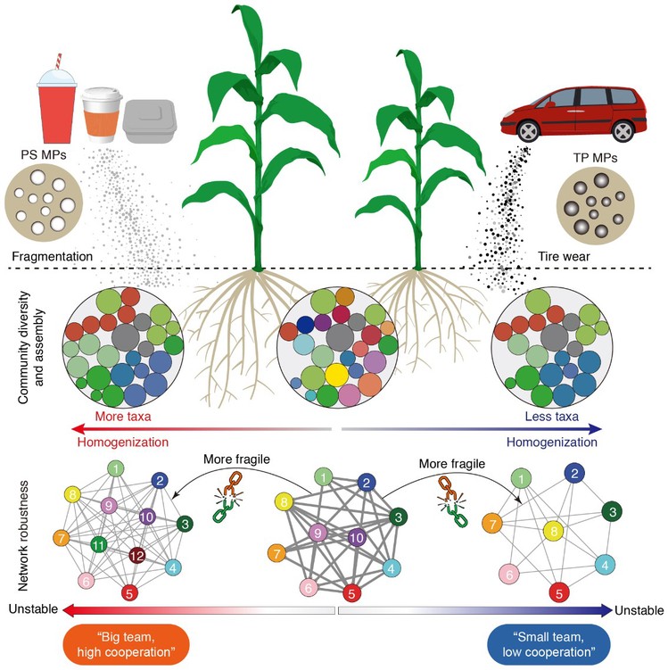 针对城市化地区道路交通(特别是高速公路)网络发达、机动车辆流量大,车轮胎磨损所导致的微塑料污染及其向周边农田的传播扩散等现实问题,团队通过盆栽实验对比研究了车辆轮胎和聚苯乙烯形成的微塑料污染对农田土壤-玉米系统中作物生长、土壤微生物多样性、网络结构及群落组装过程的影响。研究结果发现,在实验观测期间,两种微塑料对玉米生物量未产生明显影响,但高浓度的轮胎微塑料降低土壤细菌和真菌多样性以及细菌网络稳定性,驱动微生物群落的同质化发展。轮胎微塑料诱导土壤微生物群落的同质化可能会导致农田生态系统多功能性下降,进而影响农业可持续生产。相关研究结果可为评估轮胎微塑料对农田土壤生态系统功能及周边地区生态安全的持续与长期影响风险提供重要参考。相关论文发表在Journal of Hazardous Materials期刊。