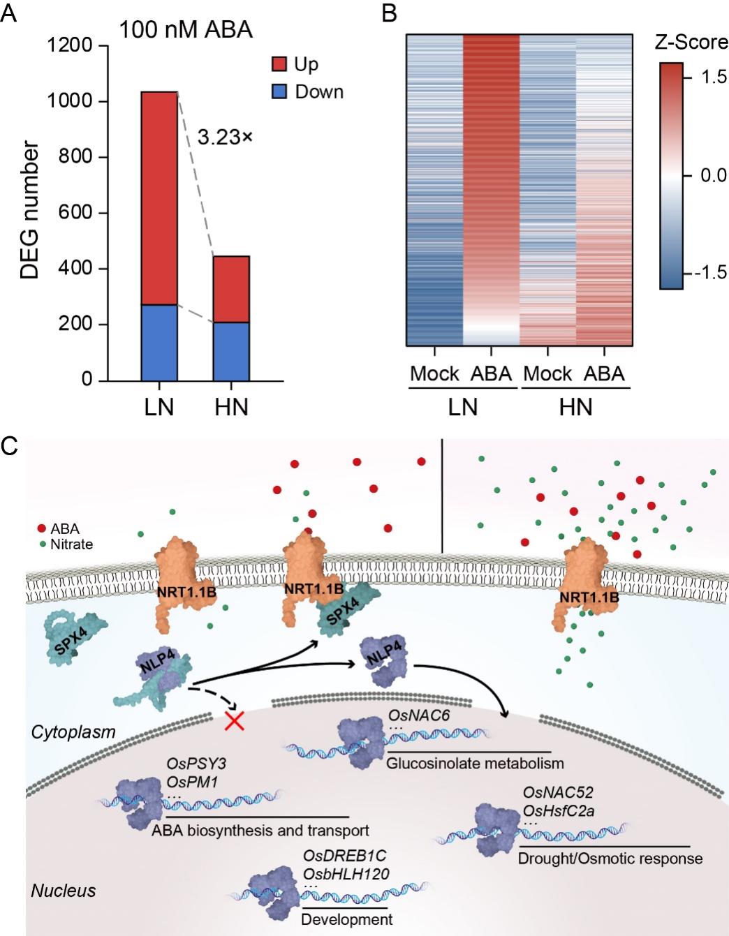在自然界中,矿质养分的有效含量通常较低,而当前植物逆境生物学及ABA信号研究却多在营养过剩的培养条件下开展。该研究发现,在低硝酸盐(LN)环境下,水稻对生理浓度ABA的转录响应十分剧烈;而在高硝酸盐(HN)环境下,这种转录响应则受到显著抑制,ABA激活基因数不足LN条件下的30%(图1A),且受诱导基因的上调程度也显著低于LN条件(图1B)。因此,LN条件下可触发更为活跃的ABA响应,这也暗示植物体内存在能够整合氮营养状态和ABA信号的分子机制,植物能根据氮营养的状态,调整对逆境的“敏感度”。
