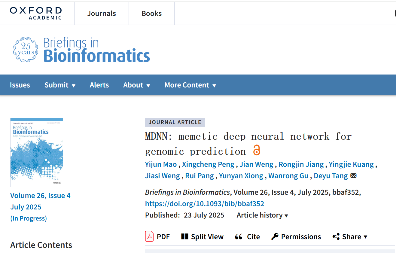 团队在《Briefings in Bioinformatics》发表题为“MDNN: memetic deep neural network for genomic prediction”的研究(毛宜军博士为第一作者,唐德玉教授为通讯作者)。团队提出的基因组学预测方法,为农作物育种提供帮助。传统的线性模型在处理简单特征方面表现良好,但在提取复杂特征的非线性特征方面存在局限性。深度学习技术的引入为基因组学预测提供了新的方法,特别适用于高维数据处理和复杂的预测。然而,传统的深度学习模型需要人工设计网络架构,这需要继续进行实验和修改。对此,团队提出了一种新的MDNN框架,利用这些算法进行更大规模的架构研究,并自动优化网络架构。与目前著名的DNNGP算法相比,MDNN在599个小麦数据集上的平均皮尔逊相关系数提高了36.49%,在2000个小麦数据集中提高了12.28%。