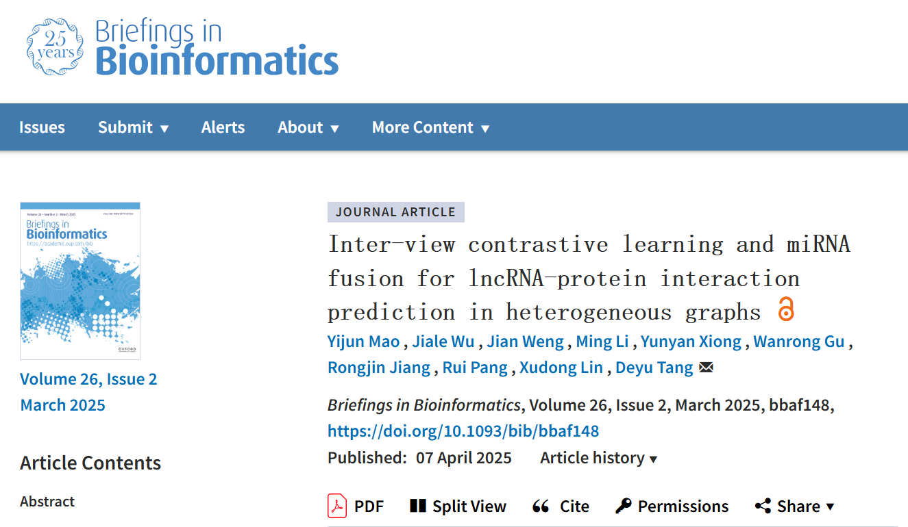 团队在《Briefings in Bioinformatics》发表题为“Inter-view contrastive learning and miRNA fusion for lncRNA-protein interaction prediction in heterogeneous graphs”的研究(毛宜军博士为第一作者,唐德玉为通讯作者)。在该项研究中,团队提出了一种基于视点间对比学习和miRNA融合的模型,称为ICMF-LPI,利用同源信息网络来增强LPI预测。该模型整合了miRNA作为介质,构建了lncRNA-miRNA-蛋白质网络,并采用路径从异质性图中提取了不同的关系,通过融合miRNA相关信息和平衡交叉视图中的反向学习,ICMF- LP有效地捕捉到了潜在的相互作用。值得注意的是,即使排除直接的LPI连接,ICMF-LPI也能实现竞争的预测准确性,其性能与某些现有模型相比更好,为开发生物信息学分子相互作用预测模型提供了一个有前景的方向。