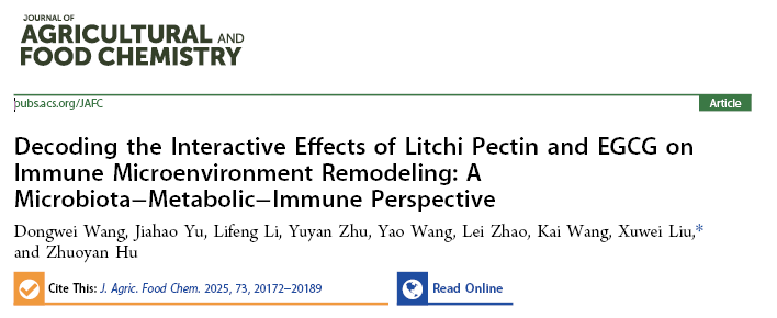 近日,乐竞在线注册食品学院岭南特色果蔬加工与营养团队在国际TOP期刊《Journal of Agricultural and Food Chemistry》发表题为“Decoding the Interactive Effects of Litchi Pectin and EGCG on Immune Microenvironment Remodeling: A Microbiota–Metabolic–Immune Perspective”的封面文章。