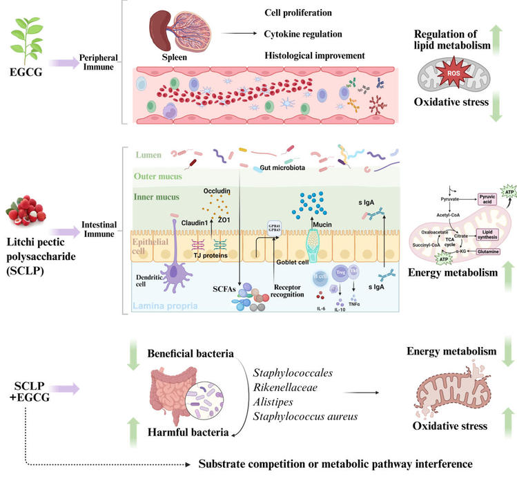 SCLP主要通过促进肠道屏障修复以及激活能量和氨基酸相关代谢通路来增强肠道免疫力。而EGCG则更显著地通过影响外周免疫器官来调节体液免疫,特别是促进淋巴细胞增殖,并增强脾脏中免疫细胞因子的分泌与表达。在重塑宿主免疫微环境方面,SCLP表现出更为优越的功效。尽管在联合干预组中,部分免疫参数(如血小板计数和IgG水平)显示出协同改善的趋势,但在与肠道屏障修复和微生物代谢相关的指标中并未观察到协同作用。相反,联合干预组中出现了底物竞争与代谢拮抗的迹象。这些发现为未来合理设计组合策略提供了重要依据,并可能有助于开发更具针对性的肠道免疫健康膳食干预方案。