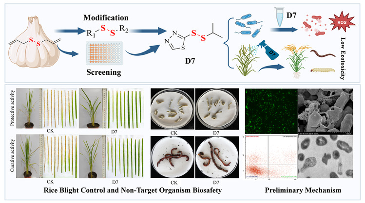 本研究首次系统评估了二硫醚类化合物对P. ananatis的体外抑菌活性。通过多路径合成策略,成功合成了41种二硫醚衍生物,并对其抑菌效能进行了系统性筛选。活性测试结果表明,化合物D7对该病原菌表现出显著抑制作用,其半最大效应浓度其EC50为0.87 μg/mL。化合物D7诱导P. ananatis的浓度依赖性细胞凋亡并提高细胞内ROS水平。此外,D7抑制细菌中SOD和CAT的活性,破坏氧化防御系统,引起ROS代谢紊乱。电子显微镜观察表明,D7会损害P. ananatis的细胞膜,导致膜塌陷和细胞质渗漏。化合物D7能有效防治P. ananatis引起的水稻细菌性叶枯病,具有显著的疗效和保护作用。此外,化合物D7在毒性测试中对非目标生物(蚯蚓和蚕)表现出低毒性。基于AquaticTox和BeeTox模型预测结果进一步表明,D7对水生生物(Oncorhynchus mykiss、Pimephales promelas、Daphnia magna、Pseudokirchneriella subcapitata)和蜜蜂均表现出低毒性。二硫醚化合物D7通过诱导氧化应激并协同破坏病原菌细胞膜的双重作用,对P. ananatis引起的水稻细菌性叶枯病表现出显著的防治效果。同时,毒性评估证实其对非靶标生物具有较低风险。