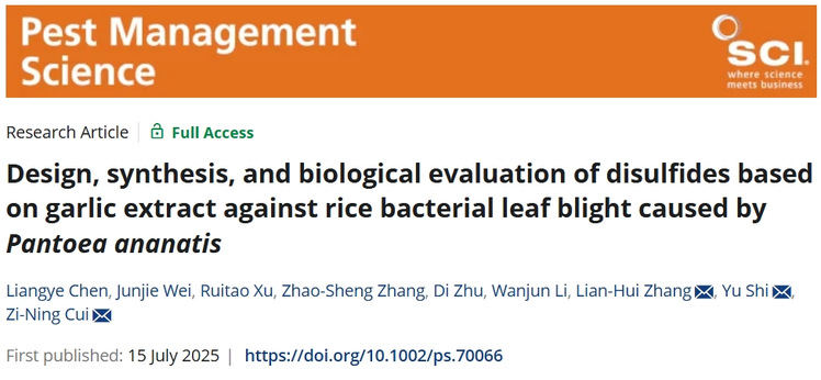 近日,群体微生物研究中心崔紫宁团队在Pest Management Science上发表题为Design, synthesis, and biological evaluation of disulfides based on garlic extract against rice bacterial leaf blight caused byPantoea ananatis的研究论文,该论文报道了一种基于大蒜提取物设计合成的二硫醚化合物抑制剂,可有效防控由菠萝泛菌 (Pantoea ananatis)引起的水稻细菌性叶枯病,并初步揭示了其作用机制。