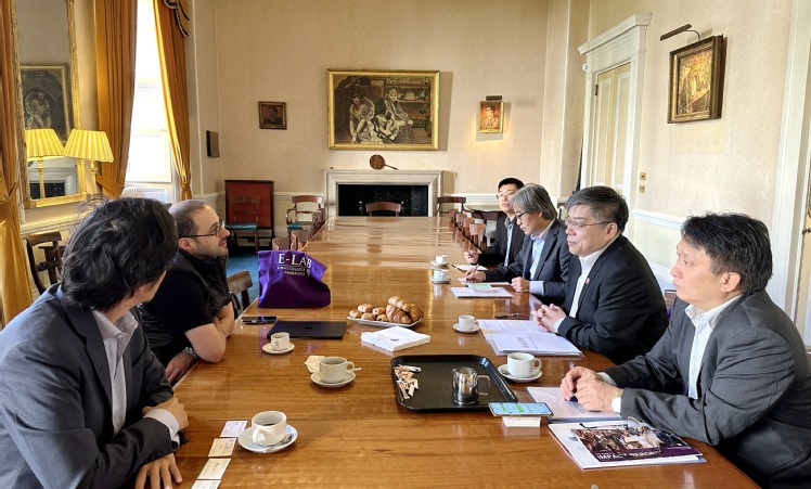 在剑桥大学,代表团与国王学院Kamiar Mohaddes教授和圣凯瑟琳学院Michael Sutcliffe教授会谈,就学生暑期课程、书院导师制、线上课程等内容进行了深入探讨,并确认了合作意愿;访问格登研究所(Gurdon Institute),深入了解其科研布局和多学科交叉优势,并看望了乐竞在线注册访问学者王文策教授。