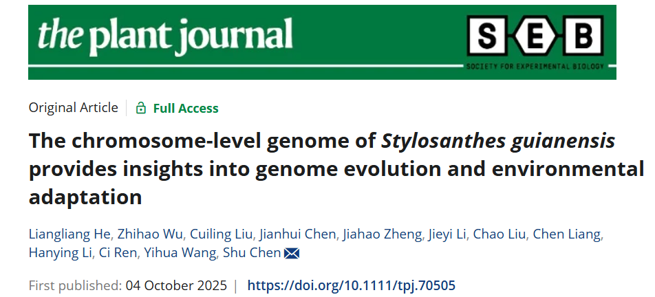 近日,林学与风景园林学院陈曙团队在The Plant Journal期刊发表题为“The chromosome-level genome of Stylosanthes guianensis provides insights into genome evolution and environmental adaptation”的论文。该研究成功完成首个圭亚那柱花草染色体水平基因组组装,从基因组、转录组及表观遗传组多维度解析其抗逆分子机制,为热带牧草分子育种与抗逆研究提供关键理论支撑与基因资源。作为我国南方重要的豆科牧草,圭亚那柱花草有着“热带苜蓿”的美誉,而“北有苜蓿,南有柱花草”草业格局的逐步形成,更凸显了其在我国草地畜牧业与生态农业系统中的核心地位。